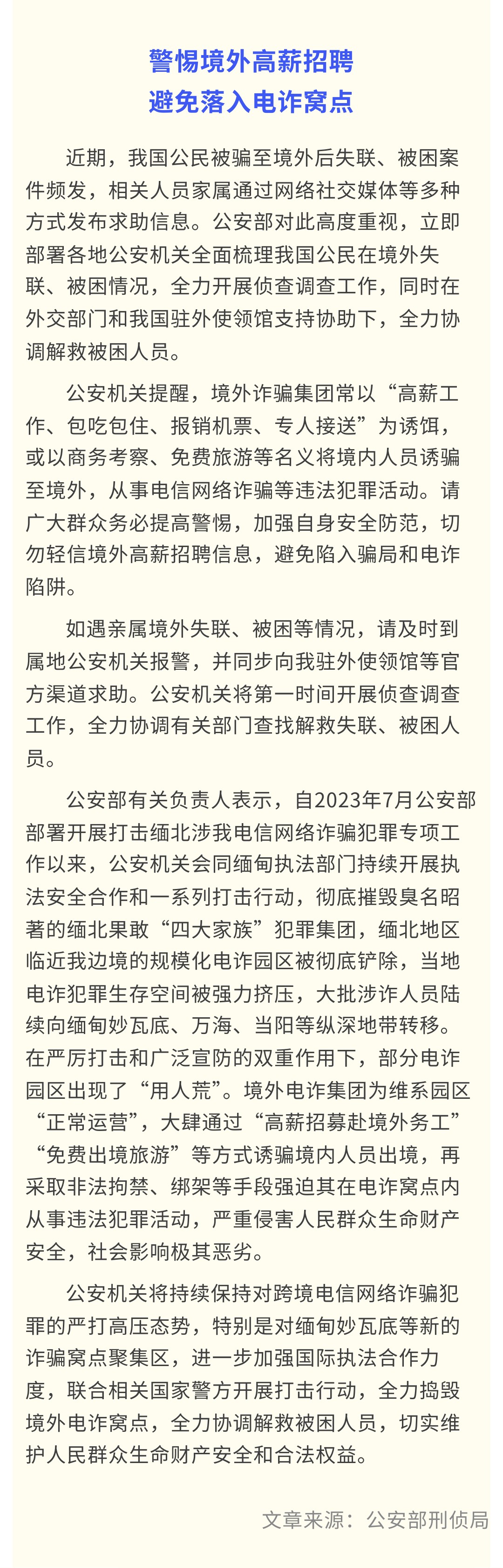 【消保反诈】公安部发布防范电信网络诈骗提示 警惕境外高薪招聘 避免落入电诈窝点